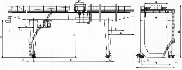 MG型門式起重機由橋梁、大車運行機構(gòu)、小車、電氣設(shè)備組成。橋架采用箱形焊接結(jié)構(gòu),大車運行機構(gòu)采用分別驅(qū)動。全部機構(gòu)均在操縱室內(nèi)操縱。起重機導(dǎo)電形式分為電纜和滑觸線兩種,訂貨時任選一種。