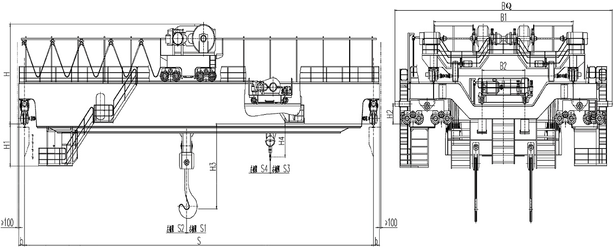 YZS型125/32~320/80噸四梁鑄造橋式天車,一般鋼廠、冶金廠用的較多,礦山起重機(jī)械還是大品牌、值得信賴
