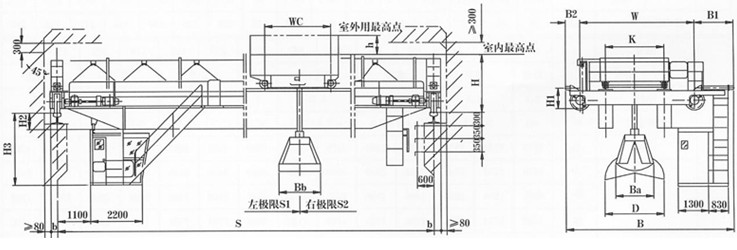 工作級別A6級,駕駛室操作。抓斗開閉方向垂直主梁,進(jìn)入操縱室的走臺門向位置為端面。
